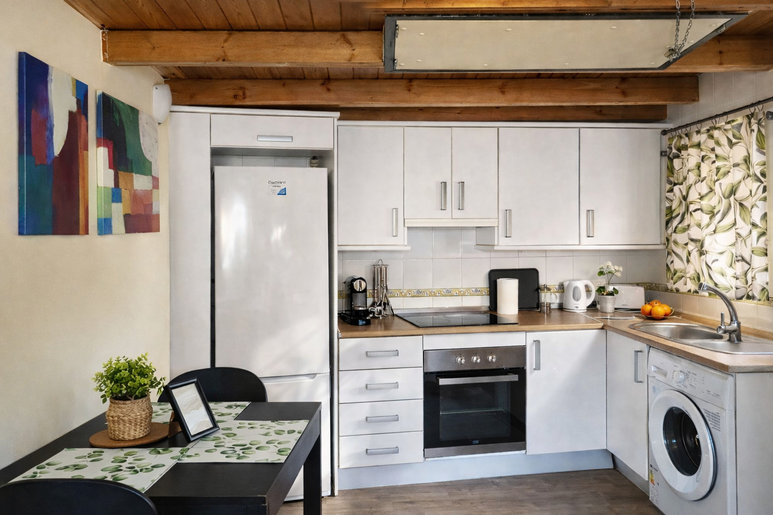 La cocina americana, de vitrocerámica, está equipada con nevera, microondas, horno, vajilla/cubertería, utensilios/cocina, cafetera, tostadora y hervidor de agua.