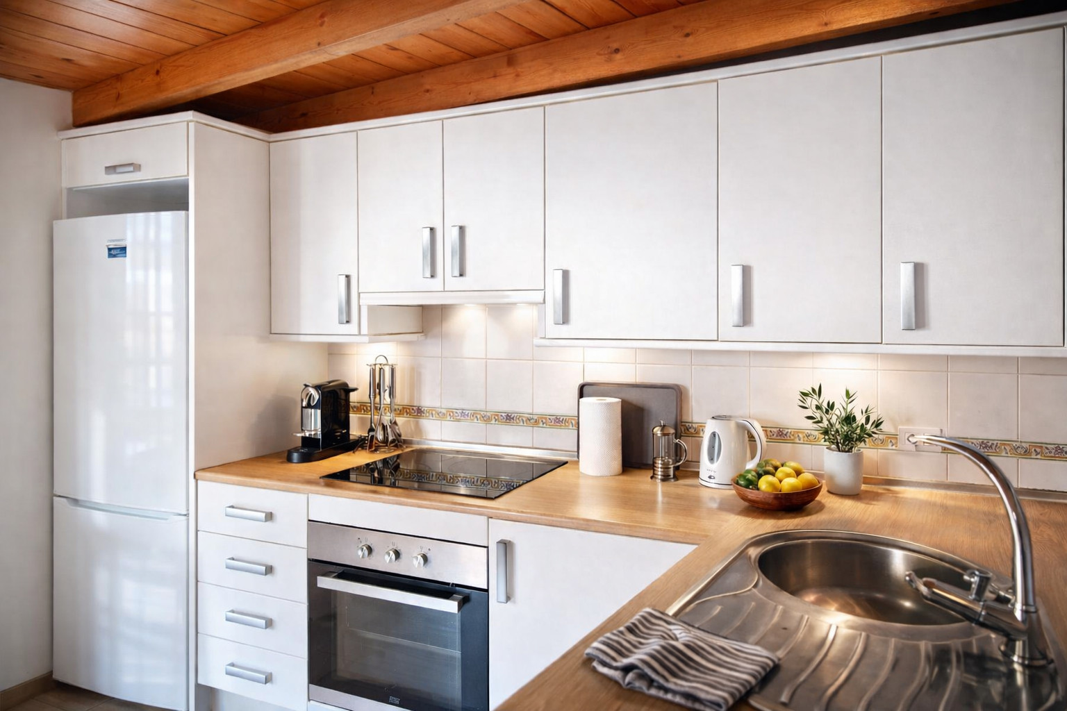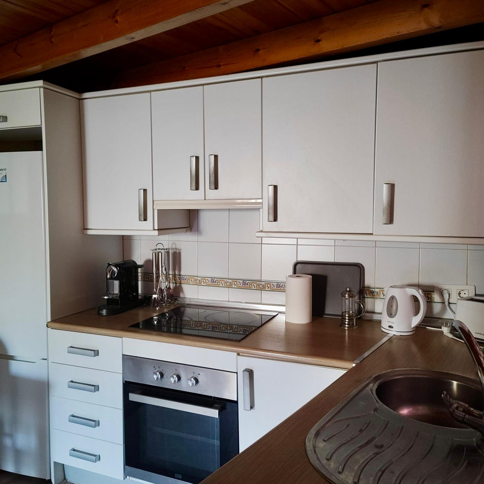 In the hotplate of glass ceramics open plan kitchen, refrigerator, microwave, oven, dishes/cutlery, kitchen utensils, coffee machine, toaster and kettle are provided.